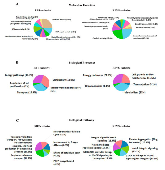 Exclusive RBT- and RBVS-exosomal proteins. Graphical representation of the molecular function (A), biological processes (B) and biological pathway (C) gene enrichment obtained by FunRich software for the 99 and 35 proteins found exclusively in RBT- or RBVS-derived exosomes, respectively.
