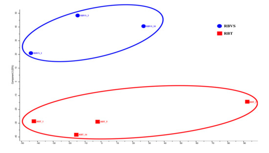 Level of similarity of individual samples. Multidimensional scaling (MDS) and k-means analysis of exosomes of RBT and RBVS proteome profile. Two-dimensional scatter plot of MDS and k-means analysis of RBT (red square) and RBVS (blue square) exosomes shows a clear discrimination between the two types of samples. The average value of the three replicates analyzed is shown.
