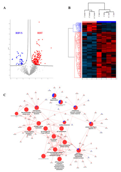 Differentially expressed proteins in RBT- and RBVS-derived exosomes and their network. (A) Volcano plot of differentially expressed proteins. Red dots depict proteins that display both large magnitude fold changes (x-axis, to the right there are proteins upregulated in RBT samples), as well as high statistical significance (−log10 of p value, y-axis). On the left side, dots representing RBVS proteins were reported, while on the right side, dots representing RBT proteins were showed. The black line shows where FDR = 0.05 and s0 = 0.1. Grey dots represent proteins for whom either fold change is <2 (log2 = 1) or p > 0.05. Each data point is smoothed out by a suitable Gaussian kernel; (B) Unsupervised hierarchical-clustered heatmap of proteins identified by t-test. The amount of each protein in individual samples is represented by the color scheme, in which red and blue indicate high and low proteins expression, respectively. The average of three biological replicates is shown; (C) Network represents the interactions between proteins that are significantly modulated between RBT and RBVS. Small nodes are proteins, while the big ones represent the functional annotation of protein clusters. The color of each node represents the fold change obtained after t-test: the red ones are RBT significant proteins, while the blue ones are the RBVS significant proteins. Similarly, the nodes that represent GO annotations are colored using pie charts according to the percentage of proteins either up- or down-regulated. ABI2 Abl interactor 2 AK2 Adenylate kinase 2, mitochondrial; AP23S1 AP-3 complex subunit sigma-1; AP2A AP-2 complex subunit alpha-2: APLP2 Amyloid-like protein 2; APP Amyloid beta A4 protein; ASNS Asparagine synthetase [glutamine-hydrolyzing]; ATP1A3 Sodium/potassium-transporting; ATPase subunit alpha-3; ATP1B1 Sodium/potassium-transporting ATPase subunit beta-1; ATP2A2 Sarcoplasmic/endoplasmic reticulum calcium ATPase 2; ATP2B2 Plasma membrane calcium-transporting ATPase 2; ATP2B3 Plasma membrane calcium-transporting ATPase 3; ATP5F1D ATP synthase subunit delta, mitochondrial; ATP6V1B2 V-type proton ATPase subunit B, brain isoform; ATP6V1C1 V-type proton ATPase subunit C 1; ATP6V1E1 V-type proton ATPase subunit E 1; ATP6V1G2 V-type proton ATPase subunit G 2; ATP8A1 Phospholipid-transporting ATPase IA; BIN1 Myc box-dependent-interacting protein 1; CALM1 Calmodulin-1; CALR Calreticulin; CAMK2B Calcium/calmodulin-dependent protein kinase type II subunit beta; CCNB1 G2/mitotic-specific cyclin-B1; COMT Catechol O-methyltransferase; CREBBP CREB-binding protein; DLD Dihydrolipoyl dehydrogenase, mitochondrial; DNAJ5 DnaJ homolog subfamily C member 5; DPYSL2 Dihydropyrimidinase-related protein 2; EHD3 EH domain-containing protein 3; ENO2 Gamma-enolase; Enolase; ENO3 Beta-enolase; Enolase; ERO1A ERO1-like protein alpha; FAM49B Protein FAM49B; FLNA Filamin-A; FXYD6 FXYD domain-containing ion transport regulator 6; GALK1 Galactokinase; GNB1 Guanine nucleotide-binding protein G(I)/G(S)/G(T) subunit beta-1; HK1 Hexokinase-1; HSP90B1 Endoplasmin; HSPA5 78 kDa glucose-regulated protein; HYOU1 Hypoxia up-regulated protein 1; ITSN1 Integrator complex subunit 1; LIN7C Protein lin-7 homolog C; MAPT Microtubule-associated protein tau; MED12 Mediator of RNA polymerase II transcription subunit 12; MIA3 Melanoma inhibitory activity protein 3; MPP1 55 kDa erythrocyte membrane protein; NAPB Beta-soluble NSF attachment protein; NDUFA2 NADH dehydrogenase [ubiquinone] 1 alpha subcomplex subunit 2; NEFL Neurofilament light polypeptide; NUP50 Nuclear pore complex protein Nup50; OGDH 2-oxoglutarate dehydrogenase, mitochondrial; PACSIN1 Protein kinase C and casein kinase substrate in neurons protein 1; PCBP4 Poly(rC)-binding protein 4; PCYOX1 Prenylcysteine oxidase 1; PDIA5 Protein disulfide-isomerase A5; PFN2 Profilin-2;Profilin; PPIF Peptidyl-prolyl cis-trans isomerase F, mitochondrial; PPP3CA Serine/threonine-protein phosphatase 2B catalytic subunit alpha isoform; PRDX2 Peroxiredoxin-2; PSMB6 Proteasome subunit beta type-6;Proteasome subunit beta type; PSMD1 26S proteasome non-ATPase regulatory subunit 1; RAB3A Ras-related protein Rab-3A; RAB3GAP1 Rab3 GTPase-activating protein catalytic subunit; ROCK2 Rho-associated protein kinase 2; SCCPDH Saccharopine dehydrogenase-like oxidoreductase; SCP2 Non-specific lipid-transfer protein; SLC1A2 Excitatory amino acid transporter 2;Amino acid transporter; SLC1A3 Amino acid transporter; Excitatory amino acid transporter 1; SLC25A13 Calcium-binding mitochondrial carrier protein Aralar2; SNAP25 Synaptosomal-associated protein 25; SOD1 Superoxide dismutase [Cu-Zn]; STOML2 Stomatin-like protein 2, mitochondrial; SV2A Synaptic vesicle glycoprotein 2A; SYT1 Synaptotagmin-1; SYTL2 Synaptotagmin-like protein 2; TLN1 Talin-1; TUBA4A Tubulin alpha-4A chain; UBQLN1 Ubiquilin-1; UQCRB Cytochrome b-c1 complex subunit 7; UQCRFS1 Cytochrome b-c1 complex subunit Rieske, mitochondrial.