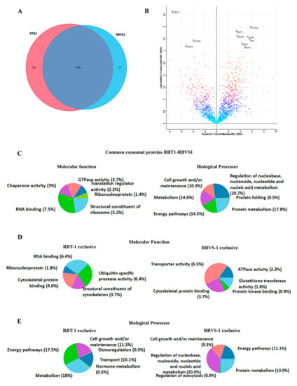 Comparison of proteins differentially expressed between exosomes, derived from RBT and RBVS of the same patient. (A) Venn diagram of the total number of detected proteins in RBT1 and RBVS1-derived exosomes. Notably, 187 proteins were exclusively present in RBT1-derived exosomes, while 77 proteins were exclusively present in RBVS1-derived exosomes. Overall, 1395 proteins were shared by the two cell lines. (B) The volcano plot illustrates the results of data obtained from the two different conditions, RBT1 and RBVS1. The proteomes are compared, starting from a value of FDR < 0.05 and S0 > 0.1. Density plot coloration highlights the similarity between the two groups, black dots are the proteins that exceed the acceptability threshold, significantly modulated. (C) Graphical representation of the molecular function and biological processes for common exosomal proteins of RBT1 and RBVS1 obtained with FunRich software. (D) Graphical representation of molecular function gene enrichment for RBT1 and RBVS1 exclusive proteins. (E) Graphical representation of biological processes gene enrichment for RBT1 and RBVS1 exclusive proteins.