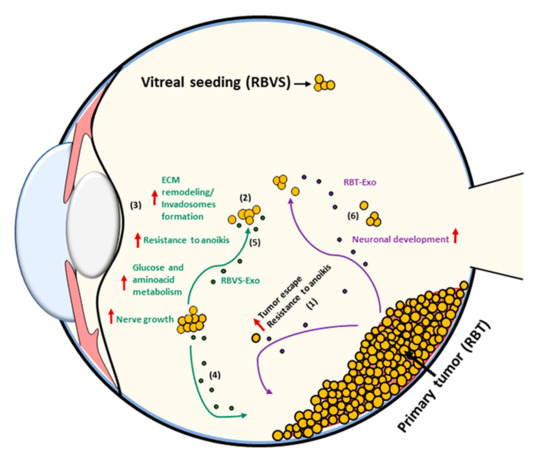 Schematic model of RBVS-exosomes role in vitreous seeding formation. From primary tumor few cells (RBT) that are able to survive in the hypoxic environment of the eye and that acquire resistance to anoikis, escape from the primary mass (1) and establish a metastasis in the vitreous (RBVS) (2). Exosomes secreted by RBVS cells are enriched in proteins implicated in ECM remodeling/invadosomes formation, resistance to anoikis, changes in metabolism and nerve growth (3). These cells can be up-taked by: (i) RBT cells inducing an invasive phenotype transferring their protein cargo and inducing anoikis resistance, formation of invadosomes, changes in metabolism in target cells (4) or (ii) by RBVS- cells strengthening their aggressiveness (5). RBT-exosomes are enriched in proteins involved in neuronal development (6).