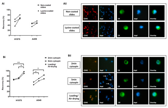 Optimization of cell harvest on slides for downstream protein expression analysis: (Ai) Recovery of pre-labeled H1975 and A549 spiked cells transferred on lysine-non-coated and lysine-coated SuperFrost Plus™ adhesion slides. (Aii) Immunofluorescence staining among lysine-non-coated and lysine-coated slides; representative staining of leukocyte common antigen (CD45)/DAPI on peripheral blood mononuclear cells (PBMCs) and of cytokeratins (CK)/DAPI on non-pre-labeled A549 cells (Ariol microscopy system, Genetix, New Milton, UK) (400×). (Bi) Recovery of pre-labeled cells using different cell harvest approaches. *, ** One-way analysis of variance (ANOVA) test; statistical significance at the p < 0.05 level. (Bii) Representative CD45/DAPI staining on PBMCs and CK/DAPI staining on non-pre-labeled A549 cells (Ariol microscopy system, 400×) following their transfer on lysine-coated slides with different approaches. Nuclear fragmentation indicated by arrows.