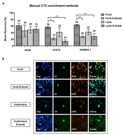 Comparison of manual circulating tumor cell (CTC)-enrichment approaches in spiking experiments: (A) Recovery rates of pre-labeled A549, H1975, and SKMES-1 cells following enrichment with each method. Values represent mean recoveries; error bars represent standard error of mean (SEM). *, ** One-way ANOVA test; statistical significance at the p < 0.001 level. (B) Representative staining of DAPI/CK/CD45 on spiked non-pre-labeled H1975 cells enriched using different methods (Ariol microscopy system, Genetix, New Milton, UK) (200×). Nuclear fragmentation indicated by arrows.