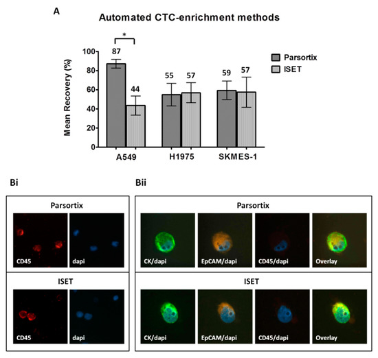 Comparison of the automated CTC-enrichment systems Parsortix and ISET in spiking experiments: Three representative non-small cell lung cancer (NSCLC) cell lines, A549, H1975, and SKMES-1, were used. (A) Recovery rates following enrichment by using Parsortix and ISET. Values represent mean recoveries; ± SEM (error bars). * Two-sided t-test; statistical significance observed at the p < 0.05 level. (B) Representative staining of DAPI/CD45 staining on PBMC (i) and of DAPI/CK/epithelial cell adhesion molecule EpCAM/CD45 staining on spiked H1975 cells (ii) enriched by the two methods (Ariol microscopy system, Genetix, New Milton, UK) (400×).
