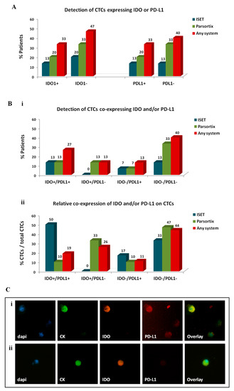 Expression of immune checkpoints, indoleamine-2,3-dioxygenase (IDO) and programmed cell death ligand-1 (PD-L1), on circulating tumor cells (CTCs) of patients with non-small cell lung cancer (NSCLC): Distribution of distinct CTC subsets enriched by different approaches. (A) Percentage of patients harbouring CTCs of distinct IDO or PD-L1 phenotypes and (Bi) percentage of patients harbouring CTCs of distinct IDO/PD-L1 co-expressing phenotypes. The detection of at least 1 CTC of a specific phenotype was used to define positivity for the respective phenotype. (Bii) Percentage of CTCs presenting distinct IDO/PD-L1 co-expressing phenotypes. Any method depicts the percentage of a specific phenotype among the total number of CTCs detected by all methods. Representative images of (Ci) IDO+/PD-L1+ CTC and (Cii) IDO+/PD-L1− CTC, Ariol microscopy system, Genetix, New Milton, UK) (400×).