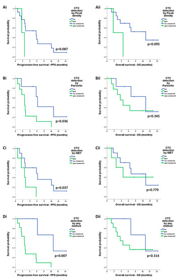 The detection of CTCs by either ISET (median: 2.5 vs 5.8 months; p = 0.037), Parsortix (median: 2.5 vs 6.2 months; p = 0.036) or any method (median: 2.5 vs 10.6 months; p = 0.007) was correlated with reduced PFS (Figure 6A–D). CTC detection was not associated with OS (Figure 6A–D).