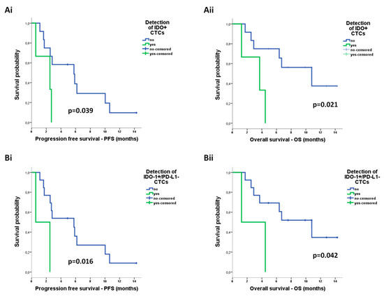 Prognostic relevance of distinct circulating tumor cell (CTC) populations enriched by Parsortix in patients with non-small cell lung cancer (NSCLC): Kaplan–Meier analysis of progression-free survival (PFS) and overall survival (OS) according to the detection of (Ai,ii) CTCs positive for indoleamine-2,3-dioxygenase (IDO) expression and (Bi,ii) CTCs positive for IDO but negative for programmed cell death ligand-1 (PD-L1) expression (IDO+/PD-L1− phenotype).