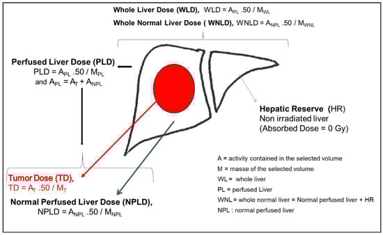 Many promising results based on cohort studies and phase II studies have been reported [1,2,3,4,5,6], with response rates (RRs) based on mRECIST or EASL criteria between 50% and 86% [1,5] and the overall survival (OS) reaching more than 20 months for patients with portal vein thrombosis (PVT) [6]. SIRT is recommended in several guidelines as the National Comprehensive Cancer Network (NCCN) guidelines for HCC [7] and in the European Society for Medical Oncology (ESMO) guidelines [8] in patients with early, intermediate-stage, or advanced stages of HCC based on the Barcelona Clinic of Liver Cancer (BCLC). However, all phase 3 trials comparing SIRT with sorafenib have been failed to demonstrate any OS improvement using SIRT in comparison with that using sorafenib [9,10,11]. Several concerns, which could explain the negativity of those studies, have been raised particularly in the absence of dosimetry endpoints, despite the fact that SIRT is a radiation oncology approach, where radiobiological rules apply [12]. For radio-induced deterministic effects, a threshold absorbed dose is mandatory to observe an effect, and the higher the absorbed dose is above this threshold, the more severe the effect is. This phenomenon exists, until the maximal effect is achieved (complete histological necrosis). Treatment planning is usually based either on an activity of 90Y in GBq to administer related to the body surface area with SIR-Sphere® [13] or on an absorbed dose delivered to the liver (80 to 150 Gy) with TheraSphere® [14]. However, in reality, SIRT planning should be based on a tumoricidal tumor dose (TD) necessary to induce a tumor response and on a normal liver dose (NLD) not to exceed to avoid liver decompensation.