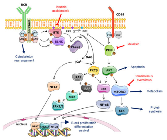 - Burger, J.A.; Wiestner, A. Targeting B cell receptor signalling in cancer: Preclinical and clinical advances. Nat. Rev. Cancer 2018, 18, 148–167. [Google Scholar] [CrossRef] [PubMed]