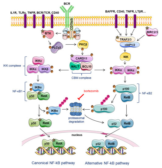 - Rahal, R.; Frick, M.; Romero, R.; Korn, J.M.; Kridel, R.; Chan, F.C.; Meissner, B.; Bhang, H.; Ruddy, D.; Kauffmann, A.; et al. Pharmacological and genomic profiling identifies NF-kappaB-targeted treatment strategies for mantle cell lymphoma. Nat. Med. 2013, 20, 87–92. [Google Scholar] [CrossRef] [PubMed]