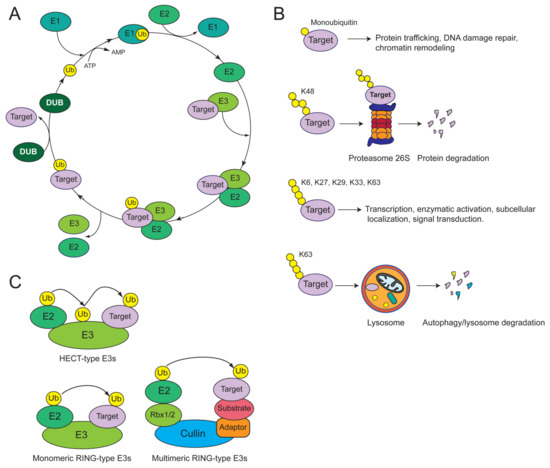 (A) The addition of ubiquitin to a target protein is a multistep, ATP-dependent process performed in three sequential enzymatic steps: activation of ubiquitin by an E1 ubiquitin activating enzyme, transfer of ubiquitin to one E2 ubiquitin conjugating enzyme and, lastly, the E3 ligase-mediated transfer of ubiquitin from E2 to the substrate protein. Ubiquitination can be reversed by deubiquitinating enzymes (DUBs), a family of isopeptidases that catalyze the removal of ubiquitin from target proteins. (B) Fate of ubiquitin-modified proteins. (C) Structural architecture and catalytic properties of HECT- and the RING finger-type E3s. HECT-type E3s form a thioester-linked intermediate with ubiquitin before catalyzing its transfer to the substrate. The RING-type E3s act as platforms for recruiting the E2 thioester-linked to ubiquitin and for juxtaposing the E2 and the substrate for the ubiquitin transfer. This family comprises of both monomeric and the multi-subunit E3s.