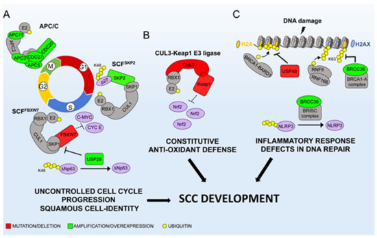 Mechanistic model describing the biological processes underlying the main molecular and genetic alterations of the ubiquitin system in SCCs. The indicated ubiquitin system-related factors are involved in cell cycle progression (A), anti-oxidant defense (B) and DNA damage checkpoint/inflammatory response (C). See text for details.