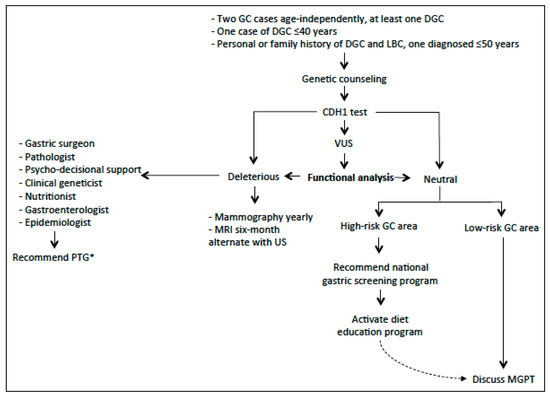 Since the early discovery of CDH1 germline mutations in Maori kindred [1], clinical interest in this cancer predisposition syndrome has progressively increased. Families affected by CDH1 germline mutations show a strong aggregation for diffuse gastric cancer (DGC) and lobular breast cancer (LBC) [2]. In 1999, the International Gastric Cancer Linkage Consortium (IGCLC), defined specific clinical criteria to select individuals for CDH1 genetic screening and introduced the definition of a new syndrome, the so-called Hereditary Diffuse Gastric Cancer (HDGC) [3]. The detection rate of CDH1 mutations using the first guidelines published by the IGCLC in 1999, was approximately 40% [4]. However, since CDH1 germline mutations were also identified in individuals who did not meet these criteria (such as those with sporadic early onset DGC and those with LBC without a family history of DGC), those criteria for CDH1 genetic testing were subsequently revised [5,6,7]. In individuals who meet the IGCLC 2010 criteria [6], the cumulative incidence of GC at age 80 years is 70% (95% CI, 59–80%) for males and 56% (95% CI, 44–69%) for females. The risk of breast cancer (BC) for females in the same study was 42% (95% CI, 23–68%) [8]. Roberts and colleagues recently reported that in individuals with CDH1 pathogenic variants identified by the MultiGene Panel Testing (MGPT), who did not meet the established clinical testing criteria, the cumulative incidence of GC at age 80 years was significantly lower: 42% (95% CI, 30–56%) for men and 33% (95% CI, 21–43%) for women [9]. The identification of unexpected CDH1 germline mutations in the absence of specific clinical criteria suggests that the HDGC syndrome might be a more complex syndrome than the one originally defined. Additionally, the low frequency of pathogenic variants in countries with high-incidence of GC has opened new discussions about the clinical management of this syndrome. In this multidisciplinary clinical review, the following major topics will be reviewed: (a) GC epidemiology and the strategies to reduce its risk; (b) CDH1 genetic testing in HLBC; (d) clinical and laboratory management of CDH1 missense mutations; and (e) prophylactic surgery, including gastrectomy and mastectomy.