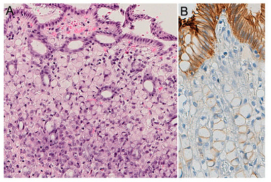 Intramucosal HDGC, pT1a. (A) Signet ring cells are larger at the surface, foveolar type; in the deeper zone, at the level of the isthmus, the neoplastic cells are much smaller, immature type. (B) E-cadherin expression (IHC) shows absence or marked decrease of E-cadherin at the cell membrane of signet ring cells.