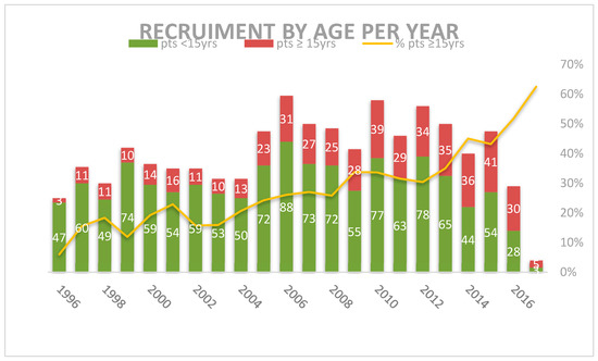 Over the 22 years between 1996 and 2017, the 1759 patients <18 years were enrolled and were considered evaluable for the study. There were 482 adolescents aged ≥15 years, representing the 27.4% of the total. Their recruitment progressively grew from 11 per year between 1997 and 1999 to 40 per year in 2015, representing 16.1% of MH’96 patients and the 32.9% of LH2004 patients (p = 0.000) (Figure 1 and Table 2).
