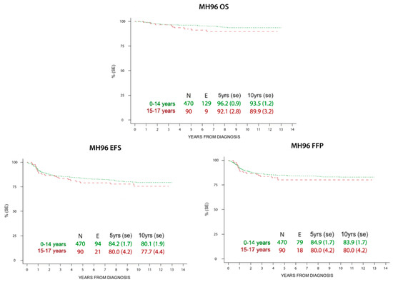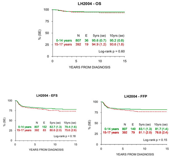 Patients with nLP HL presented a 10-year OS = 100% in both protocols [10] (Figures S1 and S2). In any case, the histotype was not associated with any favorable impact on EFS, neither in the MH’96 protocol [10] nor in the LH2004 (Figures S3 and S4), and there was no statistical difference between children and adolescents with nPL.