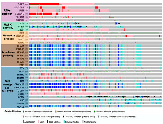 Distribution of point mutations and copy number variations in genes frequently altered in gliomas. Analysis of merged glioblastoma (GBM) and lower-grade gliomas using the TCGA dataset from cBioportal (https://www.cbioportal.org) (n = 794). ATRX: alpha thalassemia/mental retardation syndrome X-linked; BRAF: B-Raf proto-oncogene, serine/threonine kinase; CDK4/6: cyclin dependent kinase 4/6; CDKN2A/B: cyclin dependent kinase inhibitor 2A/B; CIC: capicua transcriptional repressor; EGFR: epidermal growth factor receptor; FUBP1: far upstream element binding protein 1; HMCN1: hemicentin 1; IDH1: isocitrate dehydrogenase 1, IFNA1/13/2/5/6/8: interferon alpha 1/13/2/5/6/8; IFNE: interferon epsilon; KLHL9: kelch like family member 9; LRP2: LDL receptor related protein 2; MDM2/4: mouse double minute 2/4; MET: proto-oncogene, receptor tyrosine kinase; MUC16: mucin 16; NF1: neurofibromin 1; PCLO: piccolo presynaptic cytomatrix protein; PDGFRA: platelet-derived growth factor receptor alpha; PIK3CA: phosphatidylinositol-4,5-bisphosphate 3-kinase catalytic subunit alpha; PIK3R1: phosphoinositide-3-kinase regulatory subunit 1; PKHD1: polycystic kidney and hepatic disease 1; PTEN: phosphatase and tensin homolog; RB1: retinoblastoma protein 1; RYR2: ryanodine receptor 2; SEC61G: Sec61 translocon gamma subunit (SEC61G); TP53: tumor protein; TTN: titin.