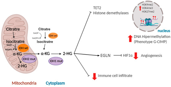 IDH mutations are somatic and mono-allelic and generate a change of an arginine residue located in the active center of the enzyme. The most frequent IDH1 mutated isoform found in gliomas (more than 85% of the cases) is the R132H, where an arginine is replaced by a histidine at position 132. A similar mutation is found in IDH2 (R172G/M/K) in 5% of IDHmut tumors. So far, no mutations related to cancer have been found in IDH3 [37]. Mutations in both IDH1 and IDH2 affect the critical residue for isocitrate binding and prevent the normal catalytic activity of the enzyme. Their pro-tumoral action is related in part to the reduction in NADPH levels and the decrease in levels of glutathione present in the body, which are necessary to reduce the deleterious effect of reactive oxygen species (ROS). In addition, IDH1/2 mutant proteins induce the production of an alternative metabolite, 2-hydroxyglutarate (2-HG) at the expense of α-KG. As a consequence, numerous enzymes dependent on the latter (histone demethylases, prolyl-hydroxylases and ten-eleven translocation (TET) enzymes) become inhibited, increasing the methylation of CpG islands and histones in the nucleus [36,37] (Figure 2). CpG islands contain a high concentration of cytosine and guanine pairs linked by phosphate. They constitute 40% of the promoters in human genes [38]. It has been shown that overexpression of mutant IDH1 in primary cultures of human astrocytes induces specific histone alterations that cause DNA hypermethylation and methylome remodeling, inducing the glioma CpG island methylator (G-CIMP) phenotype [39,40]. The G-CIMP phenotype is tightly linked with somatic IDH1/2 mutations and is normally associated with transcriptional gene silencing [41]. However, the transcription of certain genes that participate in the process of gliomagenesis, like platelet derived growth factor receptor alpha (PDGFRA) [42] and microtubule-associated protein tau (TAU/MAPT) [43], is actually induced after hypermethylation of their promoters. Altogether, these studies suggest that IDH1/2 mutations disrupt the chromosomal topology and orchestrate a complete change in the expression profile of the tumor cells, promoting tumor growth through the induction of oncogenic molecules [42] and the inhibition of pro-differentiation genes [44].