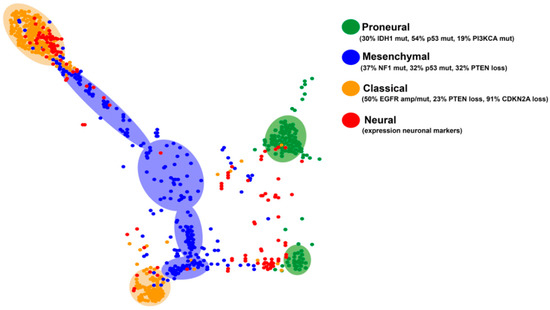 A recent analysis of the molecular subtypes of the diffuse gliomas using tumor maps (generated combining the mRNA and the methylation profiles) has allowed the identification of specific clusters in the different subtypes (Figure 3). The graph indicates that there are two divergent patterns in the PN and the CL subgroups. The neural tumors appear more dispersed, probably because this subclass does not reflect a specific history of the cells, rather a contamination of the tumor sample with normal tissue. It is noteworthy that MES GBMs do not cluster together and, in many cases, it is difficult to separate them from the CL tumors, suggesting a blurred frontier between these two entities.
