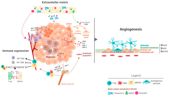The brain has a distinct and very abundant extracellular matrix content, enriched in proteoglycans, glycoproteins and glycosaminoglycans. Likewise, proteoglycans such as heparan sulfate (HS) and hyaluronic acid (HA) are accumulated in certain areas, favoring the formation of vascular and stem cell niches [93,94]. The different components of this matrix favor a coordinated action between the tumor cells and their surround stroma. CD44, which is expressed mostly in glioma cells of the MES subtype, can bind HA and osteopontin (OPN) allowing tumor cells to be retained in specific niches [95,96]. Moreover, OPN is an important chemokine for the recruitment and the M2 differentiation of macrophages [97]. Heparanase (HSPE), the main endo-glucuronidase that releases the HS side-chains of heparan sulfate proteoglycans, modifies the matrix and stimulates the proliferative and invasive capacities of gliomas [98,99]. In addition, HSPE can modify the microenvironment by inducting the production of angiogenic signals [100].