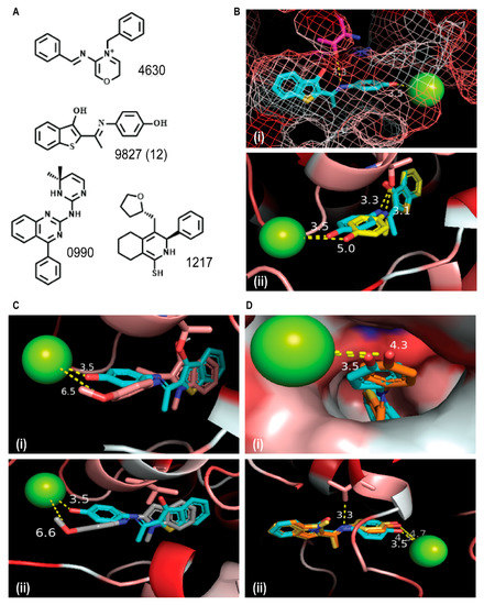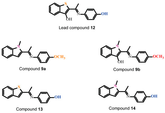 To verify these in silico predictions, we synthesized lead compound 12 and compounds 9a, 9b, 13 and 14, following the reaction routes in Figure S1. Briefly, ketimines 9a, 9b, 10–11 were synthesized from the corresponding methylketones 1–4 and anisidine (6) or O-silyl-protected p-hydroxyaniline (5 and 7) using catalytic amount of p-TsOH and toluene as solvent [23]. The reactions were performed in Dean-Stark apparatus to remove water and resulting in the target compounds in low to moderate yields. Subsequently, CsF-mediated deprotection of the silyl protection groups of intermediates 8, 10 and 11 furnished the requisite compounds 12, 13 and 14 (details of the general procedures to prepare ketimines are in the Supplementary Materials section). A panel of the basic chemical structure of the lead compound and the newly synthesized small molecules is presented in Figure 2.