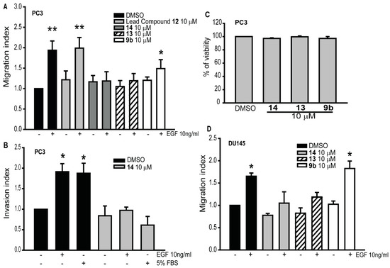 At 10 μM, compounds 9b and 12 had no effect on migration of PC3 cells in the presence of EGF (average cell number per insert ± Standard Error: 265.5 ± 9.66 and 357.25 ± 31.95, respectively. Control cells: 186.5 ± 21.68; EGF treated cells: 352.75 ± 39.4). However, compounds 13 and 14 significantly decreased EGF-induced migratory capability (211.25 ± 4.3 and 206.75 ± 23.73, respectively) (Figure 3A), an observation that is in agreement with our in silico docking prediction. To determine if these small molecules are also able to inhibit the invasive capability of PC3 cells, we performed invasion assays, using one of the most effective compound, 14. As shown in Figure 3B, the invasive capability of PC3 cells was significantly reduced in the presence of the compound in response to both EGF and FBS (586.75 ± 34.38 and 568.33 ± 61, respectively. Control cells: 654.5 ± 91.41; EGF treated cells: 1122.5 ± 153.8; 5%FBS treated cells: 1345.25 ± 91). Compounds 9b, 13 and 14 did not affect cell viability at the concentration of 10 μM (Figure 3C). We also tested the effects of these three inhibitors 9b, 13 and 14 on cell migration in DU145, an additional prostate cancer cell line. As shown in Figure 3D, compounds 13 and 14 caused inhibition of the migratory capability of EGF-induced DU145 cells (108 ± 24.17 and 91.8 ± 11.48, respectively. Control cells: 96.2 ± 18.37; EGF treated cells: 199.4 ± 31). On the other hand, compound 9b had no effect on EGF-induced cell migration (185 ± 39).