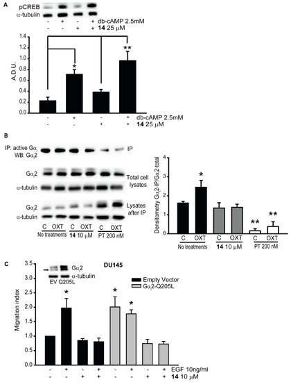 Endogenous Gαi proteins inhibit cAMP synthesis and signaling, therefore we incubated PC3 cells with compound 14 (25 μM) for one hour, and then stimulated with dibutyryl-cAMP (dbcAMP), a cell-permeable cAMP analog, at 2.5 mM for ten min. Western blot analysis for phosphorylated cyclic AMP response element-binding protein (pCREB) was performed. We observed an increase in the amount of pCREB in PC3 cells treated with Gαi2 inhibitor, compared to the control (Figure 4A), suggesting reduced Gαi activity in these cells. Then, we incubated PC3 cells with compound 14 (10 μM) for 30 min and then we treated the cells with EGF (10 ng/mL) or OXT (200 nM) for additional 30 min. We performed immunoprecipitation using anti-active Gαi antibody, and we conducted Western blot analysis using a specific anti-Gαi2 antibody. We observed that, after treatments with OXT, the levels of active Gαi2 were increased, compared to the controls. Moreover, in the presence of compound 14, the levels of active Gαi2 were significantly reduced after stimulation with OXT, compared to the controls. We used PT treatments as positive controls, which caused a significant reduction in the levels of active Gαi2 in both control and OXT-stimulated cells, as shown in the quantitative analysis graph (Figure 4B, right panel).