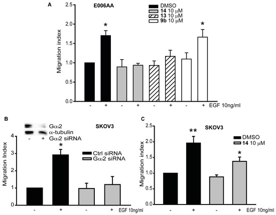 Previously, we have shown the essential role of the Gαi2 protein in the migration of prostate cancer cell lines, including E006AA cells, which have recently been found to be renal cancer cells [15,17]. In E006AA cells, compounds 13 and 14 caused the inhibition of the migratory capability of EGF-induced cell migration at 10 μM (952.66 ± 62.75 and 844 ± 81.36, respectively. Control cells: 810 ± 115.6; EGF treated cells: 1443 ± 175.21). On the other hand, compound 9b at the same concentration had no effects on EGF-induced cell migration (1324.6 ± 168.2) (Figure 5A). To determine whether Gαi2 plays a similar role in other cancers, we performed migration assays using SKOV3, ovarian cancer cell lines. In SKOV3, the knock-down of Gαi2 protein resulted in significant reduction in the number of migrating cells in EGF treated cells, (SKOV3 treated with EGF: 490.25 ± 64.79) compared with the cells transfected with control siRNA (SKOV3 control cells: 177.5 ± 37.23) (Figure 5B). As expected, treatments with compound 14 (10 μM), also impaired the migratory capability of SKOV3 cell lines, in EGF stimulated cells (control cells: 202.5 ± 29.43; SKOV3 cells treated with EGF: 470 ± 54.12) (Figure 5C).