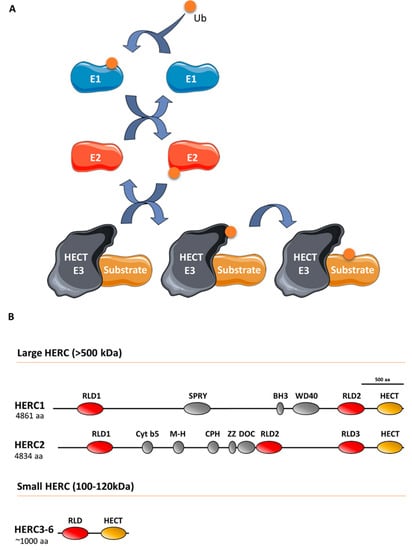 - García-Cano, J.; Martinez-Martinez, A.; Sala-Gaston, J.; Pedrazza, L.; Rosa, J.L. HERCing: Structural and Functional Relevance of the Large HERC Ubiquitin Ligases. Front. Physiol. 2019, 10, 1014. [Google Scholar] [CrossRef] [PubMed]