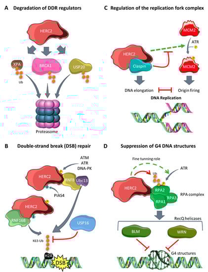 Some guanine-rich DNA sequences can fold into a secondary structure known as G-quadruplex (G4). These structures are involved in transcriptional initiation and termination, replication initiation, and telomere maintenance. However, the deregulation of G4 can cause fork stalling during DNA replication that promotes DNA damage and genome instability. HERC2 interacts with replication protein A (RPA), a heterotrimeric complex formed by RPA1, RPA2, and RPA3 and that binds to single-stranded DNA and protects it from spontaneous annealing and G4 formation. RPA assembly to the RecQ DNA helicases BLM and WRN is essential for suppressing the formation of G4 DNA structures. Under conditions of replication stress, ATR phosphorylates RPA2 at Ser33 in an HERC2-dependent mechanism. Then, HERC2 ubiquitylates the phosphorylated form of RPA2, targeting it to proteasomal degradation [64]. Although the specific effects of RPA2 phosphorylation and its later degradation by HERC2 are not fully understood, both mechanisms are essential for HERC2 to function correctly in suppressing G4 structures. HERC2 may fine-tune the levels of phosphorylated RPA2 by promoting its ATR-dependent phosphorylation and targeting it for proteasomal degradation through polyubiquitylation. This precise balance might be needed for the correct assembly of the BLM and WRN helicases to the RPA complex, as well as for the subsequent suppression of G4 structures and the maintenance of genomic stability (Figure 2D) [65].