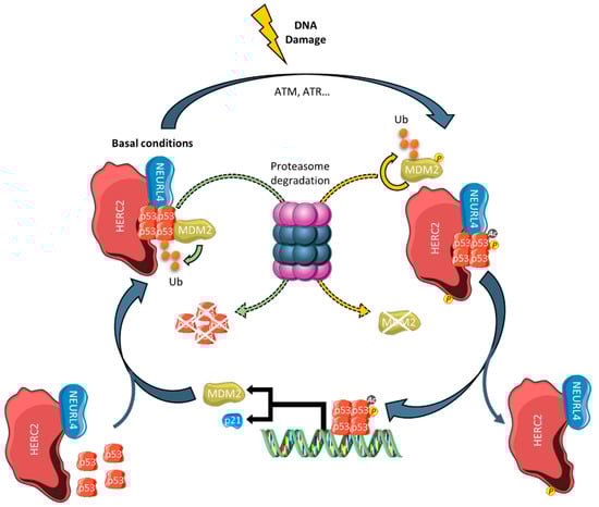 Large HERCs may also function as tumor suppressors by regulating gene expression. For example, HERC2 controls the transcriptional activity of the tumor suppressor protein p53 [66]. Tetramerization of p53 is a key step in its activation, and this oligomerization process is modulated by a complex formed by NEURL4 and HERC2 [67]. Recently, it has been reported that MDM2 is present in this complex. In non-stressed cells, this ubiquitin E3 ligase promotes lower levels of p53 by targeting it for proteasome degradation. Upon DNA damage induced by bleomycin, MDM2 is dissociated from the p53/HERC2/NEURL4 complex, and phosphorylation and acetylation of oligomeric p53 increases. Activated p53 then binds to the p53 response elements in the promoters of its target genes. MDM2 is one such gene whose promoter competes with HERC2 for binding of oligomeric, phosphorylated, and acetylated p53. As its gene expression increases MDM2 protein levels, these can bind p53 and restart the regulatory loop (Figure 3) [68]. These findings highlight the importance of HERC2 in regulating the transcriptional program of the tumor suppressor protein p53.