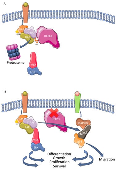 HERC1 and HERC2 each have roles in MAPK signaling. For example, HERC2 has been reported to be part of a high-molecular weight complex formed by UBE3A, NEURL4, and MAPK6/ERK3 [72]. Some cellular functions that might be regulated by this complex involve transcription, protein translation, formation and transport of vesicles, as well as metabolism [73]. To date, the precise molecular mechanism remains to be elucidated, necessitating further research. By contrast, our knowledge of the regulation of MAPK by HERC1 has evolved and grown in recent years. HERC1 controls cell proliferation through the regulation of ERK signaling by targeting the proto-oncogene C-RAF, an MAPKKK, for proteasomal degradation (Figure 4A) [74]. The HERC1 ligase also regulates the p38 pathway and cell migration. Research indicates that HERC1 knockdown increases p38 activity by increasing the levels of MKK3, an MAPKK of the p38 pathway, in a manner dependent on C-RAF. Thus, HERC1 regulates a previously unknown crosstalk between these two MAPK signaling pathways [75]. In this context, it is postulated that HERC1 functions as a tumor suppressor protein, given that its depletion leads to the dysregulation of two essential cascades for tumorigenesis (Figure 4B).