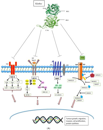 The alpha-KLOTHO gene, named after the Goddess who spins the thread of life in Greek mythology, was first discovered as an anti-ageing gene in 1997 [1]. Kuro-o et al. demonstrated that mice with a deletion of approximately eight kilobases in the kl locus of the alpha-KLOTHO gene died prematurely at 8–9 weeks of age, and displayed phenotypes similar to advanced ageing, including arteriosclerosis, skin atrophy, osteoporosis, infertility, and emphysema. In contrast, transgenic mice overexpressing alpha-Klotho had an extended life span of up to 30% compared to wild type mice [1,2]. These discoveries sparked immense interest into the role of alpha-Klotho in ageing, and many studies have since linked alpha-Klotho deficiency or mutations, to a number of age-related disease processes, including cardiovascular, renal, musculoskeletal, and neurodegenerative conditions [3,4]. In addition, emerging research has also highlighted the potential role of alpha-Klotho in the pathogenesis of human malignancies [5,6,7]. Cancer is recognized to be an age-associated condition with the incidence of many cancers increasing with age [8]. Human malignancy is predicted to be the leading cause of death and the single most important obstacle to the increase of life expectancy in the 21st century [9].