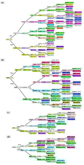 The last point to highlight is that, while the database included samples with an extended characterization, the classification trees only evaluate a very limited number of markers. Indeed, if a hypothetical FC operator decided to follow the tree structure node-by-node, he could arrive at a leaf node, i.e., at the diagnosis, with only 8 markers in the worst case scenario.