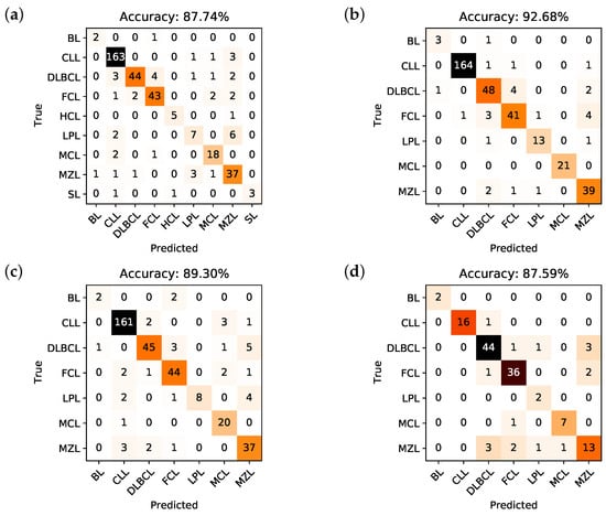 Confusion matrices and corresponding overall accuracies for the classifiers associated to Model I (a), Model II (b), Model III (c), and Model IV (d).