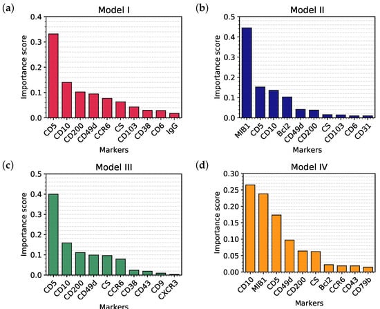 Unlike most ML or deep learning techniques, a classification tree allows the investigators to see the “rules” that the algorithm learned from the training set and then uses to classify the samples in the validation set. First of all, we can derive from the trees a classification of the markers according to their importance [23] in every model. Results are shown, respectively, in Figure 3a–d: the higher the importance, the higher the capability of discrimination, hence the higher the position inside the tree structure.