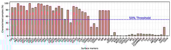 List of surface markers associated with the percentage of samples characterized for each marker. The blue dotted line indicates the threshold (50%) above which markers were considered.