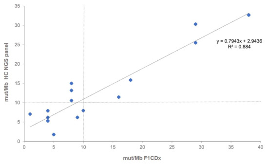 A high correlation (R2 = 0.884, 95% CI [0.799, 0.968]) between both assays was observed and the TMB category (high vs. low) showed 80% (12/15) concordance with the F1CDx category with a cut-off of 10 mut/Mb (Figure 1).