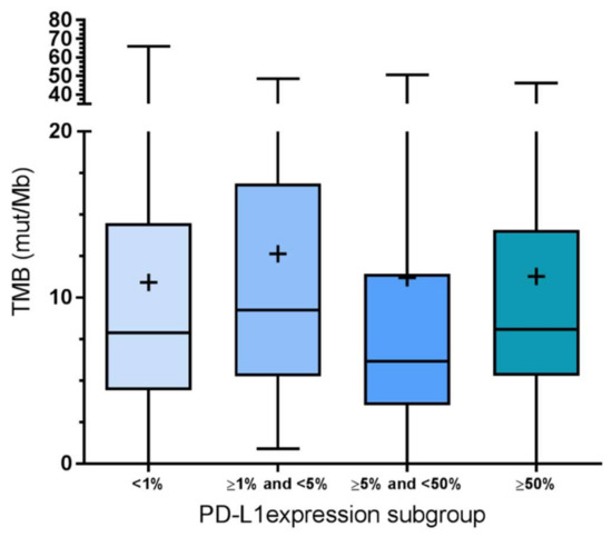 Data from the literature indicate that PD-L1 expression on tumor cells does not correlate with TMB and that TMB should therefore be considered as an independent predictive biomarker [31]. In line with this observation, we found no significant association between the TMB value and PD-L1 TPS (Figure 5). Further, we categorized the tumors on the basis of PD-L1 tumor proportion scores and observed no statistically significant association (as assessed by analysis of variance, ANOVA) of PD-L1 tumor expression and TPS scores (p = 0.798).