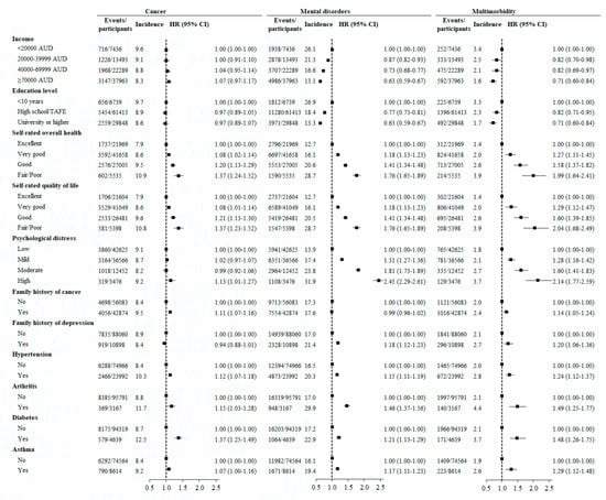 Individuals who self-reported poor/fair overall health had a higher risk of developing cancer (HR (95% CI): 1.37 (1.24–1.52), mental disorders (1.73 (1.61–1.85)), and multimorbidity (1.95 (1.60–2.37)) than those with excellent self-rated overall health. Psychological distress was associated with a higher risk of incident cancer, mental disorders, and multimorbidity. In multivariable analysis, low income and low education were risk factors for incident mental disorders and multimorbidity but not cancer. Individuals with hypertension were more likely to develop cancer (HR (95% CI): 1.13 (1.07–1.18)), mental disorders (1.15 (1.11–1.19)), and multimorbidity (1.25 (1.13–1.38)) than those without hypertension. Asthma, arthritis, and diabetes at baseline were each associated with a higher incidence of cancer, mental disorders, and multimorbidity. Family history of depression was associated with a higher incidence of mental disorders and multimorbidity but not cancer. Family history of cancer was a risk factor for incident cancer and multimorbidity but not mental disorders (Figure 2).