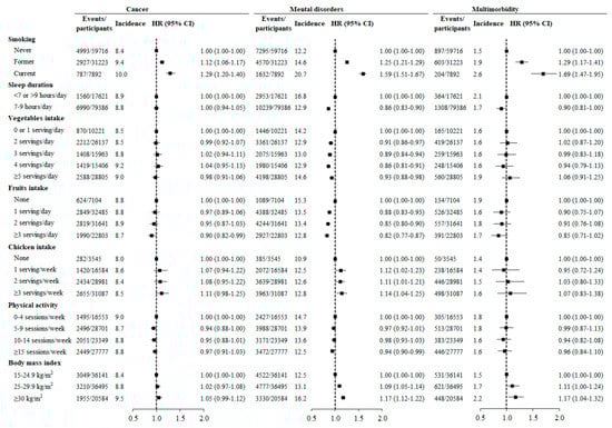 Individuals who smoked at baseline had a higher risk of incident cancer (HR (95% CI): 1.29 (1.20-1.40)), mental disorders (1.58 (1.50-1.66)), and multimorbidity (1.68 (1.46-1.93)) than those who never smoked. High fruit intake was associated with a lower risk of developing mental disorders and cancer. Obesity at baseline was associated with a higher risk of incident mental disorders and multimorbidity but not cancer. Normal sleep duration (7–9 h/night), high vegetable intake, and high levels of physical activity were associated with lower risks of incident mental disorders but not cancer (Figure 3).