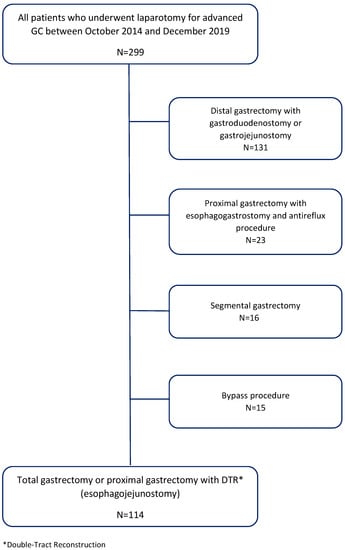 After having institutional review board approval (Bioethical Committee of Medical University of Lublin, Ethic Code: KE-0254/297/2018), we collected data from a prospectively maintained database of all patients operated on GC between October 2014 and December 2019 in the Department of Surgical Oncology of the Medical University of Lublin (Poland). The inclusion criteria were gastrectomy with direct end to side anastomosis between the stump of the distal esophagus, and jejunum. Thus, patients in whom total gastrectomy followed by Roux-en-Y esophagojejunostomy or proximal gastrectomy with double-tract reconstruction (DTR) were included. The exclusion criteria were: distal gastrectomy followed by Rydygier, Billroth II or Roux-en-Y anastomosis, proximal gastrectomy with esophagogastrostomy and anti-reflux procedure, bypass procedure or segmental gastrectomy. Some 114 patients were eligible for the analysis. A flow chart of the study with numbers of patient selection is presented in Figure 1.