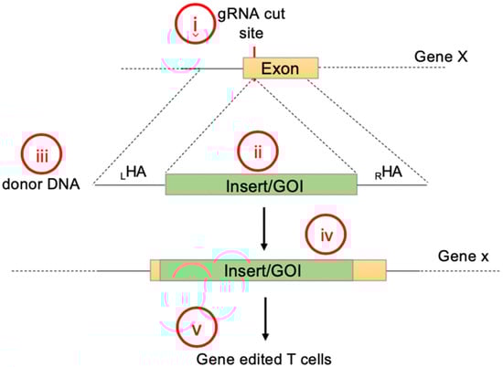 Genetic engineering approaches that aim to integrate a therapeutic gene into a targeted locus have the potential to solve the problems associated with random integration. Site-specific gene integration can be achieved with the use of gene-editing tools (e.g., CRISPR-Cas9, transcription activator-like effector nucleases (TALEN), zinc finger nucleases (ZFN), meganucleases), which results in DNA double-strand breaks (DSBs) and homology-directed repair (HDR) when a donor DNA template is provided. This approach is known as gene knock-in (KI). In addition, a newly emerging Cas9 base editor technology, which can make gene modifications without DSBs, holds great promise for gene KI in T cells [14]. More and more KI studies are emerging using CRISPR-Cas9 in human T cells to develop clinically useful engineered T cells. In one of the first proof-of-concept studies, a short 12 base pairs (bp) oligonucleotide flanked by 90 bp homology arms was used to create a targeted gene modification at the C-X-C chemokine receptor type 4 (CXCR4) locus resulting in 20% knock-in efficiency and creating a targeted gene modification [15]. In another study, applying site-specific DNA integration, programmed cell death protein 1 (PD-1) expression was reduced by 58.6% using a single-stranded DNA oligo (99 bp) carrying a single nucleotide deletion mutation [16].