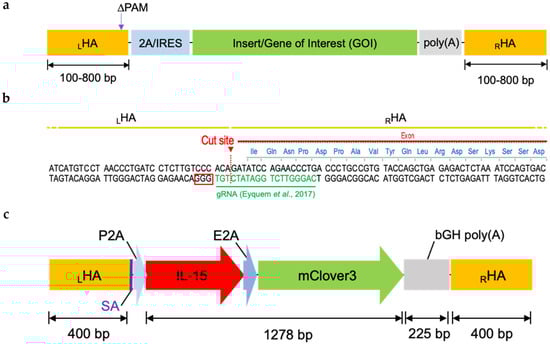 While there are many published studies on gene editing using CRISPR-Cas9-mediated knock-in, there are no universal guidelines on how to design a donor/template DNA for HDR-mediated gene insertion. Donor DNA consists of a gene of interest (GOI) flanked by left and right homology arms (LHA and RHA), which are sequences homologous to the target locus (Figure 2a). In addition, the donor DNA can also include other elements such as a promoter, enhancer, and 2A self-cleaving peptide or internal ribosome entry site (IRES) sequence at the 5′ and poly(A) signal at the 3′ end. HAs are designed to flank the Cas9 cutting site, with equal length HAs of up to 800 bp per side (Figure 2a,b). Based on these rules, our final donor DNA for the TRAC locus contained the following parts: 400 bp LHA, spliced acceptor (SA) [18], P2A (porcine teschovirus-1 2A peptide), IL-15, E2A (equine rhinitis A virus 2A peptide), mClover3, poly(A) (bovine growth hormone polyadenylation signal), and 400 bp RHA (Figure 2c). We included a P2A sequence at the 5′ end to separate our transgene from a possible fusion to the endogenous gene, and a poly(A) sequence at the 3′ end for efficient termination as simple STOP codon might not be sufficient. Lastly, we also mutated the protospacer adjacent motif (PAM) sequence in the LHA to inhibit the Cas9 enzyme from repeatedly cutting the DNA in this location. The construct was then synthesized by GeneArt and inserted into the pMA plasmid. This plasmid was then used as a template for PCR reaction to amplify dsDNA and to generate donor DNA for HDR-mediated gene knock-in using CRISPR-Cas9.