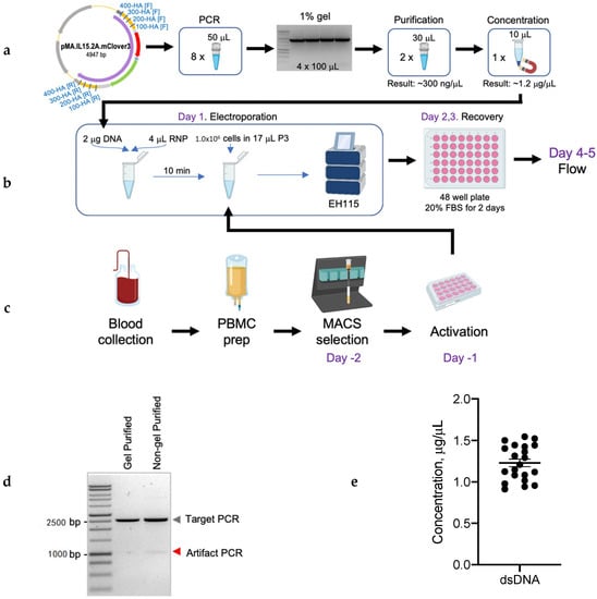 Figure 3. Overview of the steps to generate transgene knock-in in T cell: (a) Molecular steps considering vector design, amplification, purification, and concentration DNA. (b) Electroporation of RNA ribonucleoproteins (RNPs) and donor template to T cells using Lonza instrument. (c) Human T-cell preparation before electroporation. Complete and detailed knock-in protocol can be found in the Supplementary Materials. (d) The 1% agarose gel showing PCR amplicons that were gel purified vs. non-gel purified. (e) Concentration of dsDNA template after purification and concentration (n = 24).