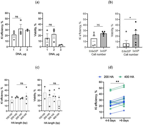 Figure 4. Optimization steps to increase transgene knock-in (KI) efficiency in T cells: (a) Three different dsDNA template concentrations were evaluated for the best knock-in efficiency and cell viability (n = 3 for 1 and 2 µg, n = 2 for 3 µg; two-tailed t-test; ns—not significant). (b) Two different numbers of T cells were tested for electroporation (n = 5, two-tailed paired t-test, * p = 0.041). (c) Four different lengths of homology arms flanking the transgene of interest were evaluated (n = 2–4, one-way ANOVA, ns—not significant). (d) Knock-in efficiency was tested at early (4–6 days) and late (>9 days) time points post-electroporation (n = 15, two-tailed paired t-test; ** p = 0.0015).