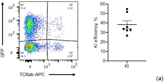 15. Schumann, K.; Lin, S.; Boyer, E.; Simeonov, D.R.; Subramaniam, M.; Gate, R.E.; Haliburton, G.E.; Ye, C.J.; Bluestone, J.A.; Doudna, J.A.; et al. Generation of knock-in primary human T cells using Cas9 ribonucleoproteins. Proc. Natl. Acad. Sci. USA 2015, 112, 10437–10442. [Google Scholar] [CrossRef] [PubMed]