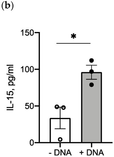 IL-15 production was measured using a Human IL-15 Quantikine ELISA Kit (R&D Systems, Minneapolis, MN, USA) according to the manufacturer’s protocol. IL-13 production was analyzed using Human IL-13 Quantikine ELISA Kit (R&D Systems, Minneapolis, MN, USA). For measuring IL-15 secretion upon T-cell activation, 5.0 × 105 T cells were washed with PBS, resuspended in 275 µL of T-cell media (RPMI, 10% FBS, and 1% GlutaMAX) without cytokines and plated in 96-well, V-shaped plates. Cells were then activated with Immunocult™ Human CD3/CD28/CD2 T Cell Activator (StemCell Technologies, Vancouver, Canada) following the manufacturer’s protocol and incubated at 37 °C. After 24 h, 250 µL of media was collected for IL-15 ELISA from the wells and stored at −80 °C.
