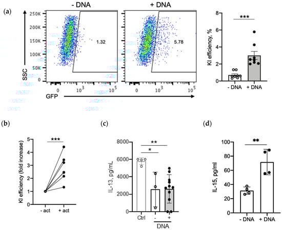 Figure 6. IL-15.E2A.mClover3 knock-in into IL-13 locus: (a) Transgene expression was evaluated by flow cytometry of GFP+ T cells 10 days post-electroporation; left panel, representative flow plots (samples electroporated without template DNA (-DNA) served as controls); right panel, summary graph of left panel (n = 8, two-tailed t-test; *** p = 0.0004). (b) Fold increase of knock-in efficiency without (-) or with (+) T-cell activation (n = 6, two-tailed t-test, *** p = 0.0005) (c) Knock-out of IL-13 was confirmed by IL-13 secretion; Ctrl, control knock-out; -DNA, knock-in without DNA template; +DNA, knock-in with DNA template (n = 3–11, one-way ANOVA, * p = 0.036 ** p = 0.007). (d) IL-15 expression from IL-13-edited (10 days post-electroporation) T cells 24 h post-T-cell activation (n = 4, two-tailed t-test, ** p = 0.005).