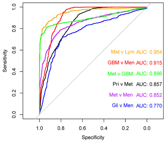 | Metastasis v Meningioma | 210/111 | PLS-DA + up | 71.3 | 6.2 | 86.1 | 5.5 | 78.7 | 3.6 |